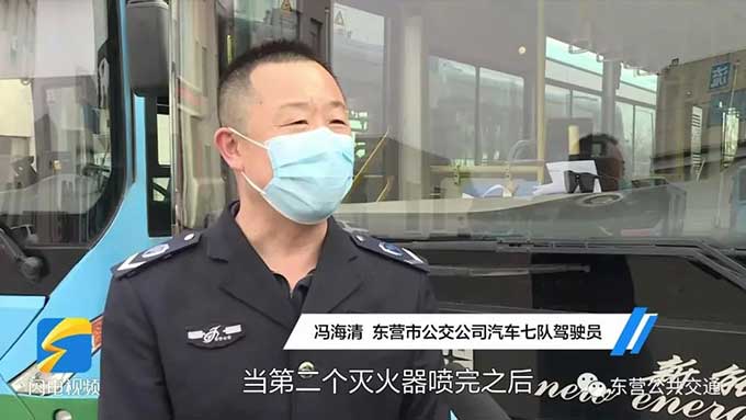 恰巧在這個時候,東營市公交公司公交車駕駛員馮海清駕駛178路公交車行駛至東營市一中站點附近,于是帶著車上的滅火器趕緊上前施救。然而噴完一罐滅火器后,煙依然很大,馮海清便趕忙回到車廂拿了兩罐,當(dāng)?shù)诙€滅火器噴完之后,火勢得到有效控制,最終在噴完第三罐滅火器后,徹底把火撲滅了。