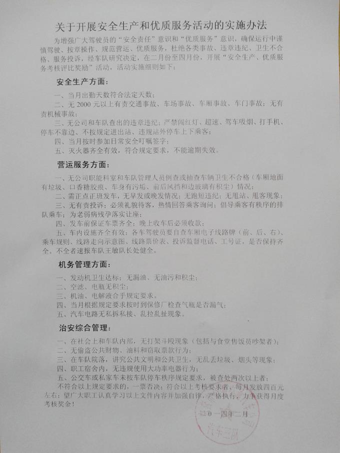 為增強(qiáng)廣大駕駛員的“安全責(zé)任”意識(shí)和“優(yōu)質(zhì)服務(wù)”意識(shí),促使駕駛員出車前做好車輛檢查和衛(wèi)生保潔,運(yùn)行中謹(jǐn)慎駕駛、優(yōu)質(zhì)服務(wù),收車后規(guī)范停車,減少各類違章違紀(jì)、服務(wù)投訴和行車事故,杜絕單車衛(wèi)生不合格和不收款現(xiàn)象發(fā)生,實(shí)現(xiàn)職工薪金跨年度平穩(wěn)過渡,市公交公司汽車三隊(duì)充分利用部分工資結(jié)余,發(fā)揮經(jīng)濟(jì)杠桿作用,自2014年2月份起制定實(shí)施了“安全生產(chǎn)和優(yōu)質(zhì)服務(wù)考評(píng)獎(jiǎng)勵(lì)辦法”。