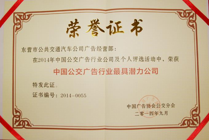 近日,在中國廣告協(xié)會公交分會舉行的《中國公交廣告行業(yè)最具影響力公司》和《中國公交廣告行業(yè)最具潛力公司》評選活動中,東營市公交公司廣告部喜獲“中國公交廣告行業(yè)最具潛力公司”稱號,這表明在公司領(lǐng)導(dǎo)的大力支持和全體職工的共同努力下,經(jīng)廣告行業(yè)協(xié)會的規(guī)范引領(lǐng),廣告部的各方面工作已經(jīng)取得了穩(wěn)步的發(fā)展,具備了一定競爭實(shí)力,這一稱號,將進(jìn)一步激發(fā)全體廣告職工的工作熱情,以整體強(qiáng)勁的勢頭,投身到激烈的行業(yè)競爭當(dāng)中,再創(chuàng)更好的經(jīng)濟(jì)效益和社會效益。