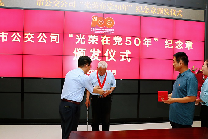 6月24日上午,在中國共產黨成立100周年即將到來之際,東營公交組織開展了“光榮在黨50年”紀念章頒發(fā)儀式。公司黨委書記趙龍、經理劉海、副經理孫紅光、景洪培和黨齡50周年老黨員以及黨員代表等參加了頒發(fā)活動。