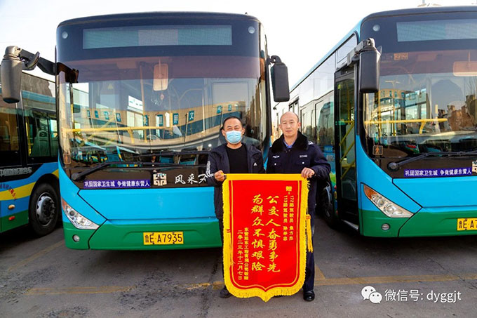 2023年12月8日,東營旭東工程公司的代表來到東營公交集團(tuán)汽車七隊(duì)贈送一面錦旗,上面寫著“公交人奮勇爭先,為群眾不懼艱險(xiǎn)”的字樣。這時(shí)大家才知道,原來是兩位公交駕駛員見義勇為幫助他們滅了一輛正在自燃的小貨車。