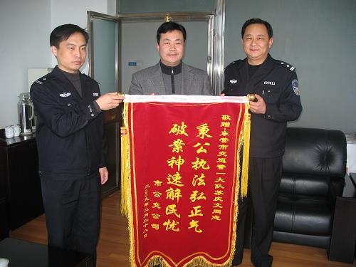 3月2日,為感謝交警部門秉公執(zhí)法,伸張正義,市公交公司委派汽車一隊的兩位隊長向事故處理中心干警蘇慶文同志贈送了“破案神速解民憂,秉公執(zhí)法弘正氣”的錦旗。