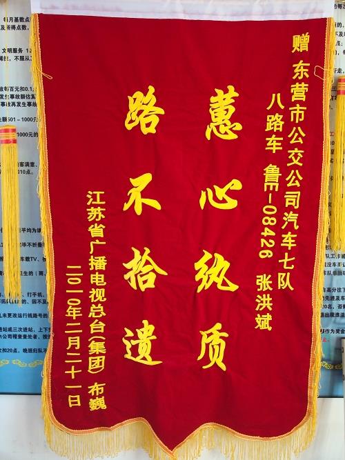 原來,2月20日,初次來東營走親訪友的失主布巍小酌后準備返程,不小心將手提包丟在8路車上,內(nèi)有DV機、出國護照和工作證等物件,年后就準備出國的他非常著急。經(jīng)過查詢與汽車七隊取得聯(lián)系,當?shù)弥眯鸟{駛員張洪斌已將失物及時上交車隊,失主布巍非常感動,因急于趕回單位出國,沒能當面致謝,特寄來錦旗表示謝意。