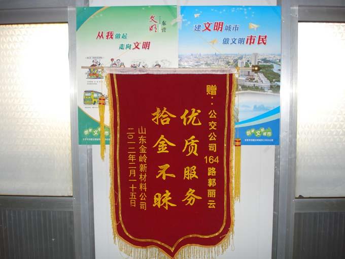 這位小伙子名叫燕同意,是山東金嶺新材料公司的一名職工,2012年2月15日上午,剛下了早班的燕同意乘坐8:40的164路返回東城,下車時將錢包落在了公交車上。跑回東城的駕駛員郭麗云在打掃車輛衛(wèi)生時看到了一個棕色的牛皮錢包,里面3000多元現(xiàn)金,4張銀行卡,1張銀聯(lián)卡,1張身份證。面對鼓鼓的錢包,郭麗云第一時間將錢包交到了車隊。并與車隊工作人員一起通過包內(nèi)的卡片多方聯(lián)系,在短短不到半個小時內(nèi)便將錢包送到了失主的手中。小燕問駕駛員名字,郭麗云卻怎么也不肯告訴他。小燕通過多方打聽才知道了她的姓名。時隔多日,小燕帶著感激的心情送來了一面寫有“優(yōu)質服務、拾金不昧”的錦旗。