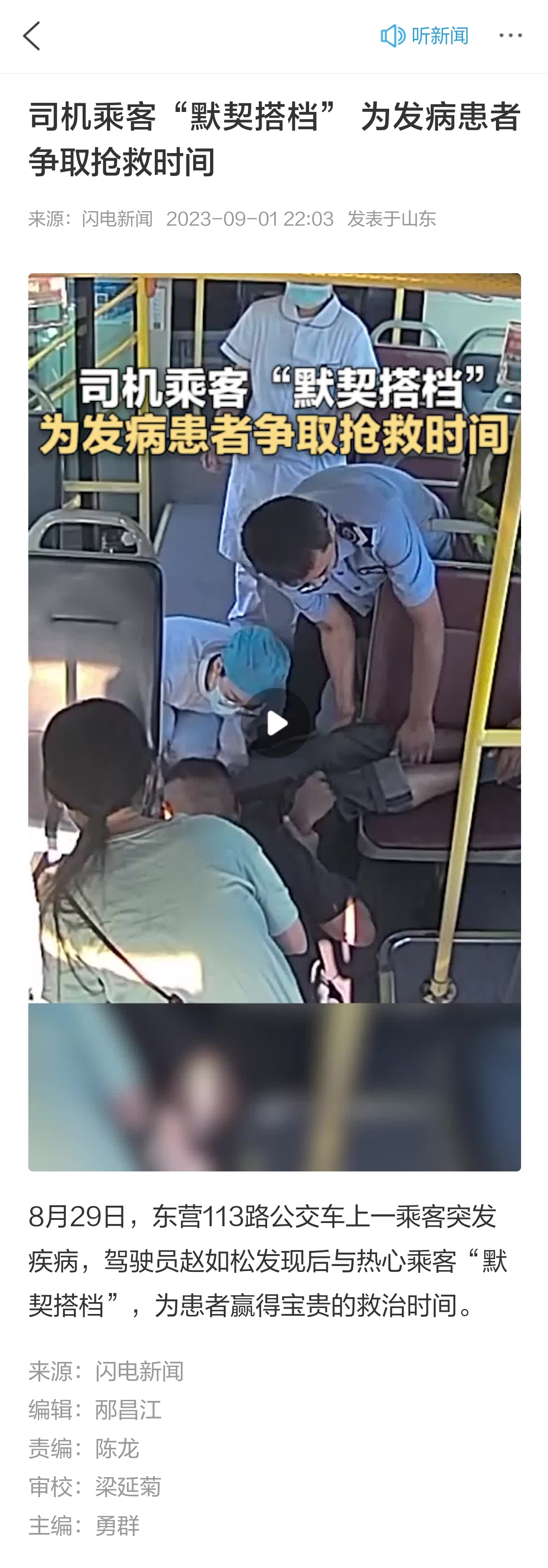 2023年8月29日下午4點(diǎn)58分左右,正在駕駛113路公交車的趙如松聽到了車內(nèi)乘客的呼救。他從車內(nèi)后視鏡看過(guò)去,發(fā)現(xiàn)車內(nèi)一男性乘客正在渾身抽搐,然后倒地不起,此時(shí),坐在他后方的一名乘客見(jiàn)狀,立馬跑到駕駛員旁邊呼救。趙如松師傅馬上靠邊停車,并上前查看乘客情況,因接受過(guò)急救培訓(xùn),趙師傅立馬判斷,該乘客可能是突發(fā)疾病,在向公司匯報(bào)并征得車內(nèi)乘客同意后,立即將公交車開往醫(yī)院,為患者爭(zhēng)取急救時(shí)間。車輛到達(dá)到市人民醫(yī)院南門后,趙如松和急救人員合力將患者抬到急救擔(dān)架上,一起送到急救室,看著他情況穩(wěn)定后,才返回工作崗位駕車駛離。
